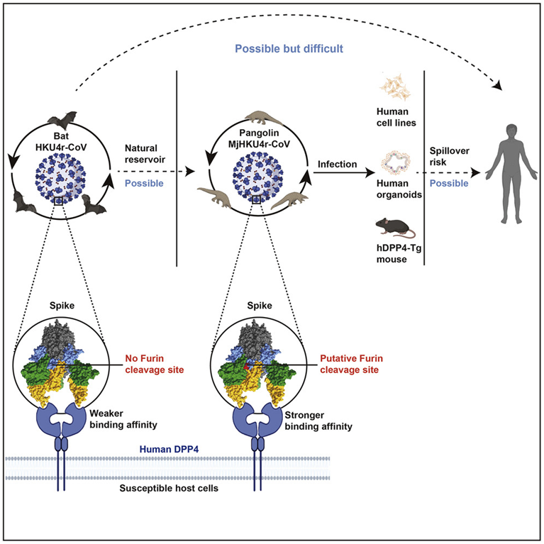 近日,中国科学院武汉病毒研究所与广州实验室、广西医科大学、北京化工大学、复旦大学等单位合作,在《Cell》上发表题为“A bat MERS-like coronavirus circulates in pangolin and utilizes human DPP4 and host proteases for cell entry”的研究论文,报道了在穿山甲中发现的一株新型MERS簇冠状病毒,并证实该病毒可利用人DPP4受体和宿主蛋白酶入侵细胞。