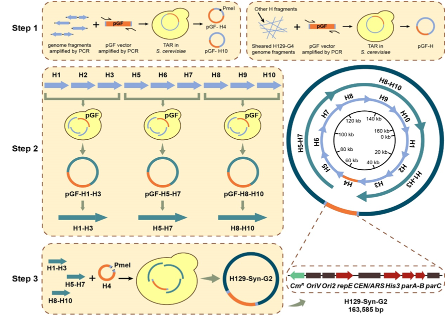 HSV-1 H129株是一株具有独特顺向跨突触传播特性的I型单纯疱疹病毒临床分离株,作为载体在神经环路示踪领域等有着广泛应用。然而传统分子生物学手段难以实现对HSV-1在全基因组水平的编辑,限制了其进一步应用。研究团队以神经示踪病毒H129-G4为模板,在酵母中合成了带绿色荧光基因的病毒全基因组,将其转染哺乳动物细胞,成功拯救出了H129-Syn-G2。研究表明,该病毒具有与亲本病毒相似的感染性和形态学特征,且细胞水平复制能力优于模板病毒。该技术的建立为今后开展神经环路示踪病毒改良、溶瘤病毒开发以及抗病毒药物筛选等研究提供了良好的平台。