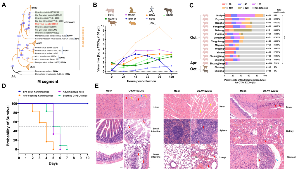 图1. Oya病毒库蠓新分离株的遗传进化(A)、体外感染特征(B)、家畜血清抗体阳性率(C)、感染小鼠的生存率(D)和组织病理学特征(E)