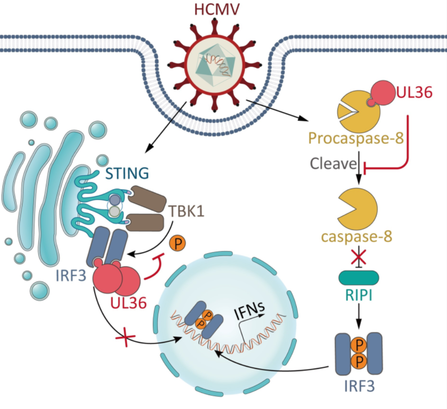 )发表了题为“Human cytomegalovirus UL36 inhibits IRF3-dependent immune signaling to counterbalance its immunoenhancement as apoptotic inhibitor”的研究论文。该研究揭示了人巨细胞病毒(HCMV)通过其编码的UL36蛋白,对天然免疫与外源性细胞凋亡双重抑制的新机制,对揭示HCMV与宿主免疫相互作用及致病机制具有重要意义。