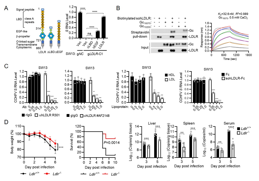尽管CCHFV已被发现六十多年,但其入侵细胞的受体一直未被发现。王延轶研究组根据CCHFV感染细胞的路径和特性进行分析,另辟蹊径,通过野生型CCHFV病毒感染候选基因敲除细胞进行筛选发现,LDLR是CCHFV的一个入侵受体。研究发现,不同类型细胞膜上LDLR的水平与CCHFV的感染嗜性呈正相关。在LDLR缺失的人、猴和小鼠来源的多种细胞中,CCHFV的感染显著降低。LDLR可以与CCHFV的包膜蛋白Gc直接结合,介导病毒的吸附和内吞。靶向LDLR的阻断抗体、LDL以及可溶性LDLR在细胞水平中均可显著抑制CCHFV感染。动物感染实验发现,敲除LDLR的小鼠在感染CCHFV后,致死率、体内病毒滴度和组织病变均明显降低。此外,利用靶向LDLR的阻断抗体处理小鼠也能有效降低CCHFV复制,显著减少组织病变、降低致死率。该研究表明,LDLR对CCHFV的入侵至关重要,不仅加深了对CCHFV感染复制和致病机制的了解,同时也发现靶向LDLR的阻断抗体、LDL和可溶性LDLR等可以作为CCHFV感染的潜在防治策略。