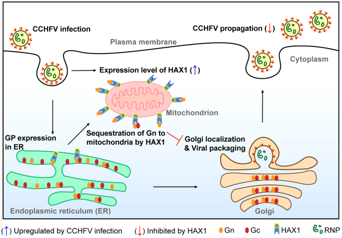 图1.宿主因子HAX1靶向CCHFV糖蛋白抑制病毒增殖的分子机制模式图。