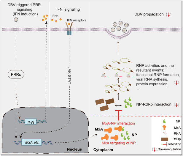 图2.MxA靶向SFTSV复制机器抑制病毒感染的分子机制模式图。