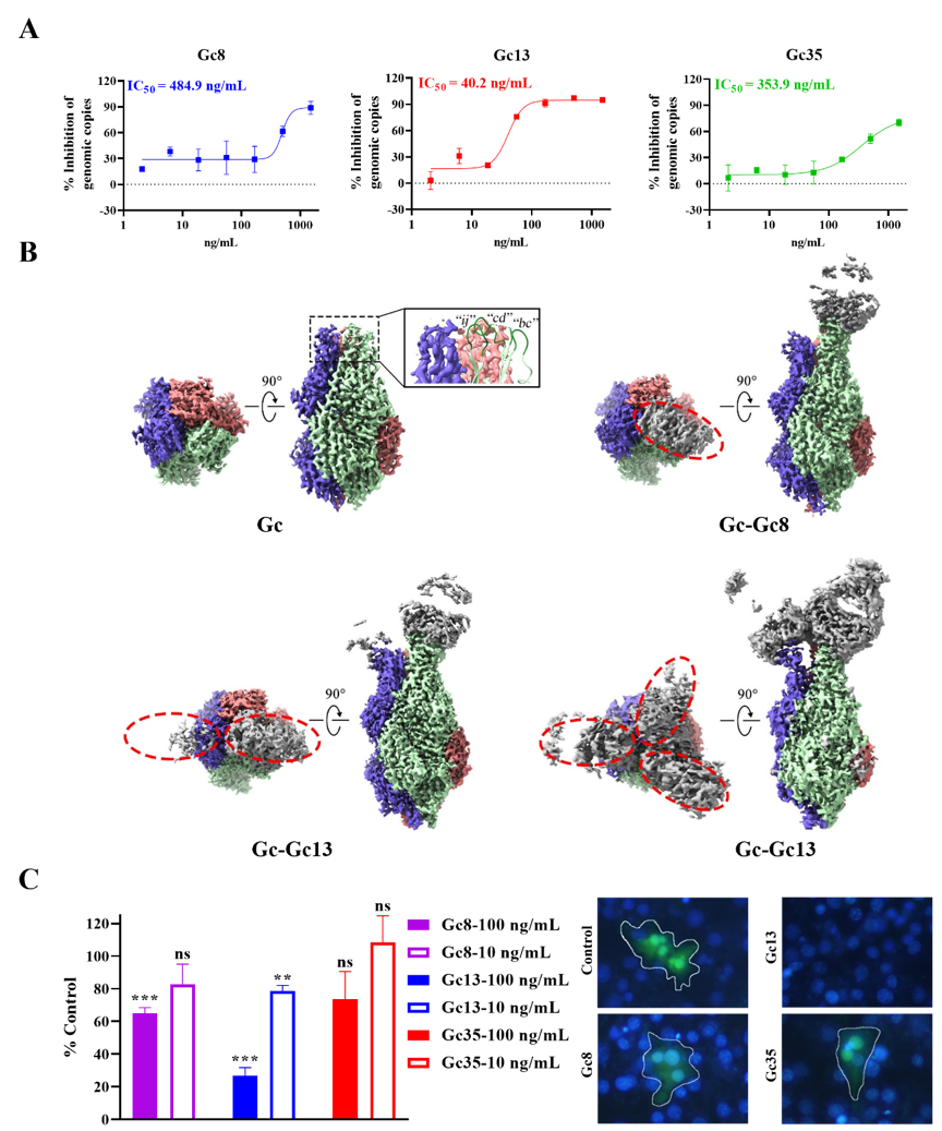 近期,中国科学院武汉病毒研究所王曼丽/曹晟/胡志红/严兵团队合作在国际学术期刊PLoS Pathogens发表了题为“Neutralizing monoclonal antibodies against the Gc fusionloop region of Crimean–Congo hemorrhagic fever virus”的研究论文。该研究制备了克里米亚-刚果出血热病毒(CCHFV)的中和性单抗,并通过冷冻电镜等技术阐述了其作用机制,对克里米亚-刚果出血热(CCHF)的防治具有重要意义。