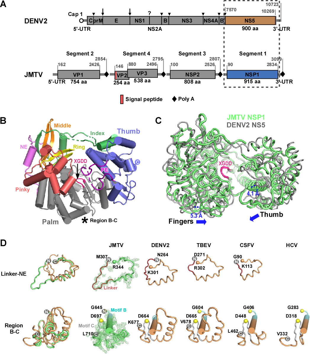 图1.JMTV RdRP结构特征。A)登革病毒(DENV)与JMTV基因组结构对比图;B)分辨率为1.8埃的JMTV RdRP晶体结构(PDB号:8WIM);C)JMTV与DENV的RdRP三维结构对比图;D)JMTV与四种代表性黄病毒科RdRP的特征性亚结构对比图(上:N端延伸区与甲基转移酶-RdRP连接区;下:基序B-基序C连接区)。