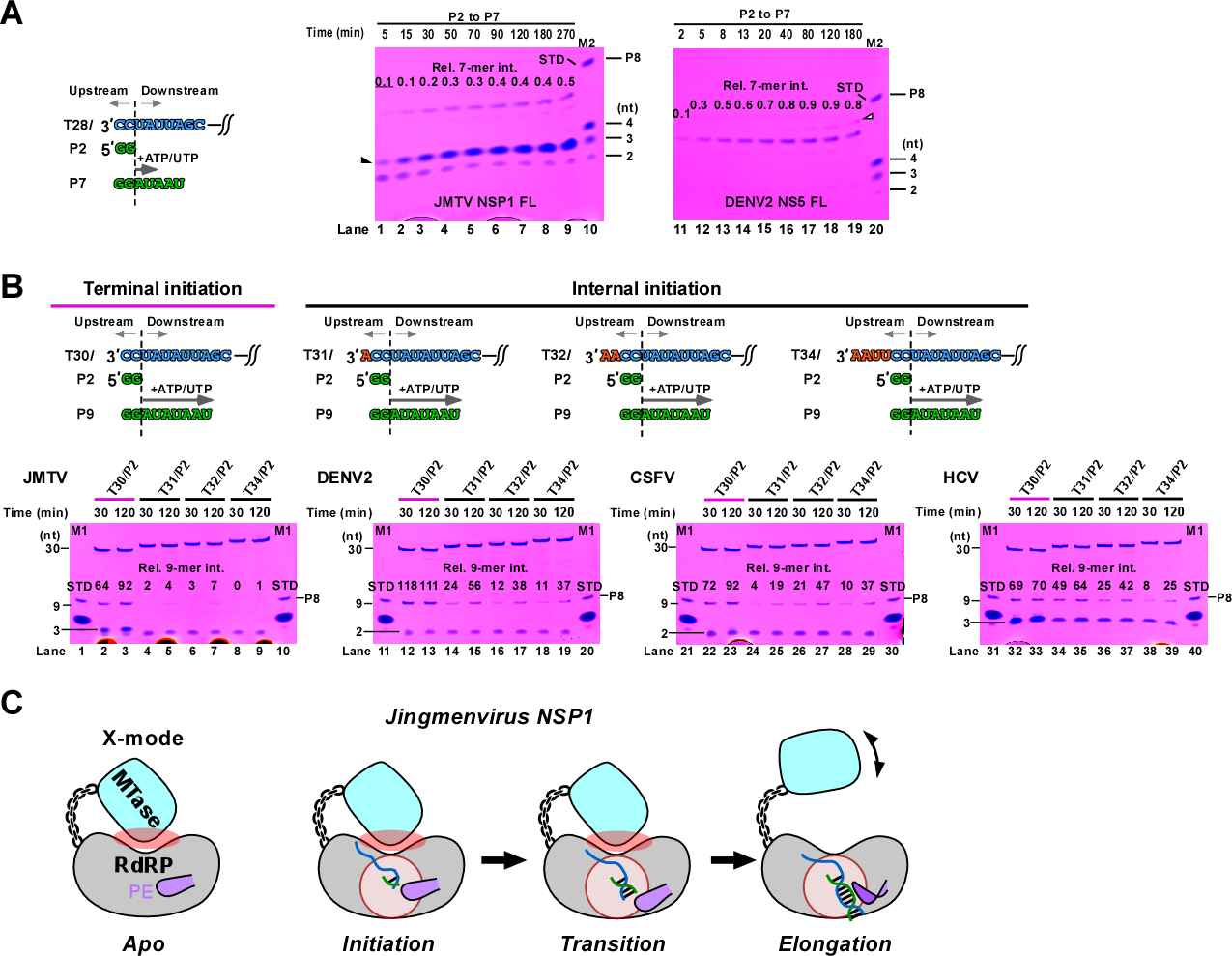 图2.JMTV RdRP的特征性酶学性质。A)与登革病毒(DENV)NS5相比,JMTV NSP1在二核苷酸(P2)引发的合成中产生了明显的三核苷酸流产性产物(实心三角标记);B)与黄病毒科的代表性RdRP相比,JMTV NSP1具有最强的末端引发倾向;C)荆门病毒NSP1的整体构象尚不明确(X-mode),但其甲基转移酶(MTase)在RdRP从合成引发阶段向延伸阶段转换过程中发挥辅助作用。