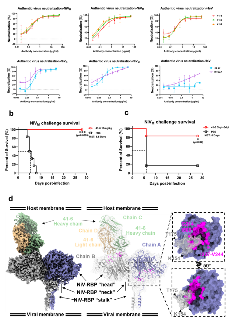 在本研究中,通过噬菌体展示技术,筛选获得了两株针对NiV受体结合蛋白(RBP)的人源中和抗体(NiV41和NiV42)。通过亲和力成熟进一步提升抗体活性发现,来源于NiV41的抗体对NiV和其同属病毒亨德拉病毒(Hendra virus,HeV)表现出交叉活性,而来源于NiV42的抗体特异靶向NiV。对抗体的免疫遗传学分析发现,抗体的成熟度与其抗病毒活性之间存在相关性。以仓鼠为感染模型,对抗体的体内活性评价表明,NiV41来源的成熟抗体41-6能对感染NiV的仓鼠提供有效保护。基于冷冻电镜获取的四聚体RBP和抗体复合物结构揭示41-6通过阻断受体结合发挥中和作用。总的来说,该研究不仅为尼帕病毒的防治提供了候选抗体药物,也为开发更多针对亨尼帕病毒的药物和疫苗提供了有效信息。
