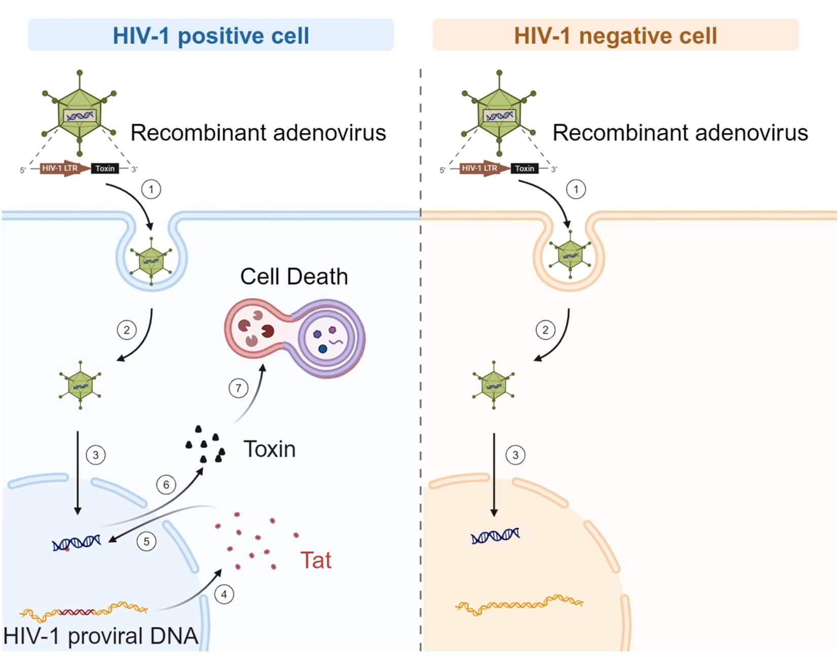 该项研究基于学科组前期在腺病毒免疫原性和基因转导方面的工作基础(Vaccine. 2018,36(29):4287-4297;J Gen Virol. 2015,96(8):2381-2393),构建了一种HIV-1 Tat依赖的条件复制型腺病毒(Tat-CRAds-DTA),并利用体外和体内实验评估了该条件复制型腺病毒的抗HIV-1效果。Tat-CRAds-DTA对HIV-1阴性细胞无明显细胞毒性,仅能在HIV-1感染细胞中选择性增殖并表达白喉毒素A链(DTA),特异性诱导HIV-1感染细胞死亡并抑制HIV-1复制。此外,在HIV-1感染的人源化小鼠模型中,Tat-CRAds-DTA也表现出了显著的治疗效果。以上研究结果证明了Tat-CRAds-DTA作为治疗HIV-1感染的新型疗法的潜力。