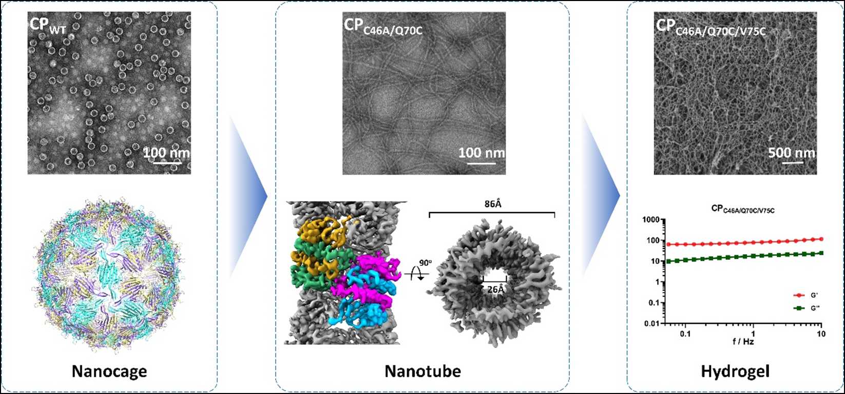 图1. MS2衣壳蛋白组装体由笼形到管状再到凝胶的形态操控。