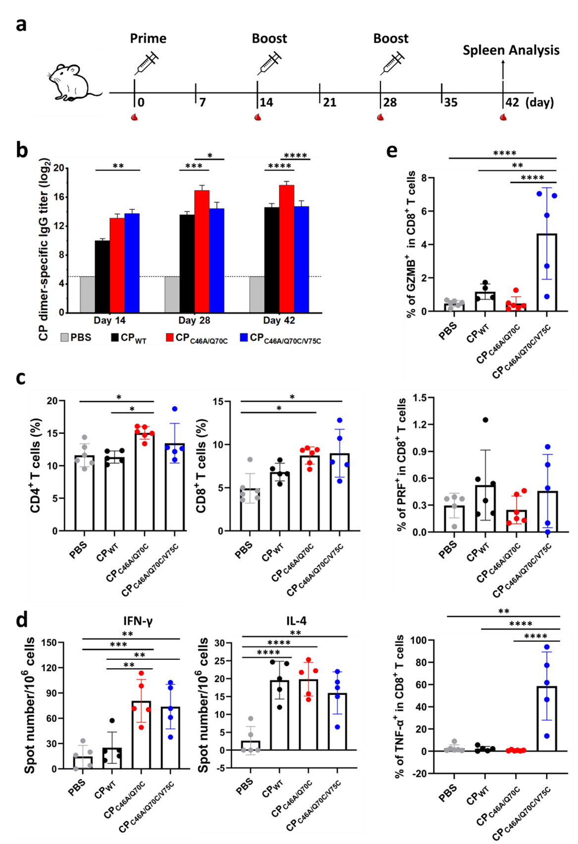图2. 纳米组装形态显著影响MS2病毒衣壳蛋白的免疫应答。CPWT,纳米笼;CPC46A/Q70C,纳米管;CPC46A/Q70C/V75C,纳米管凝胶。