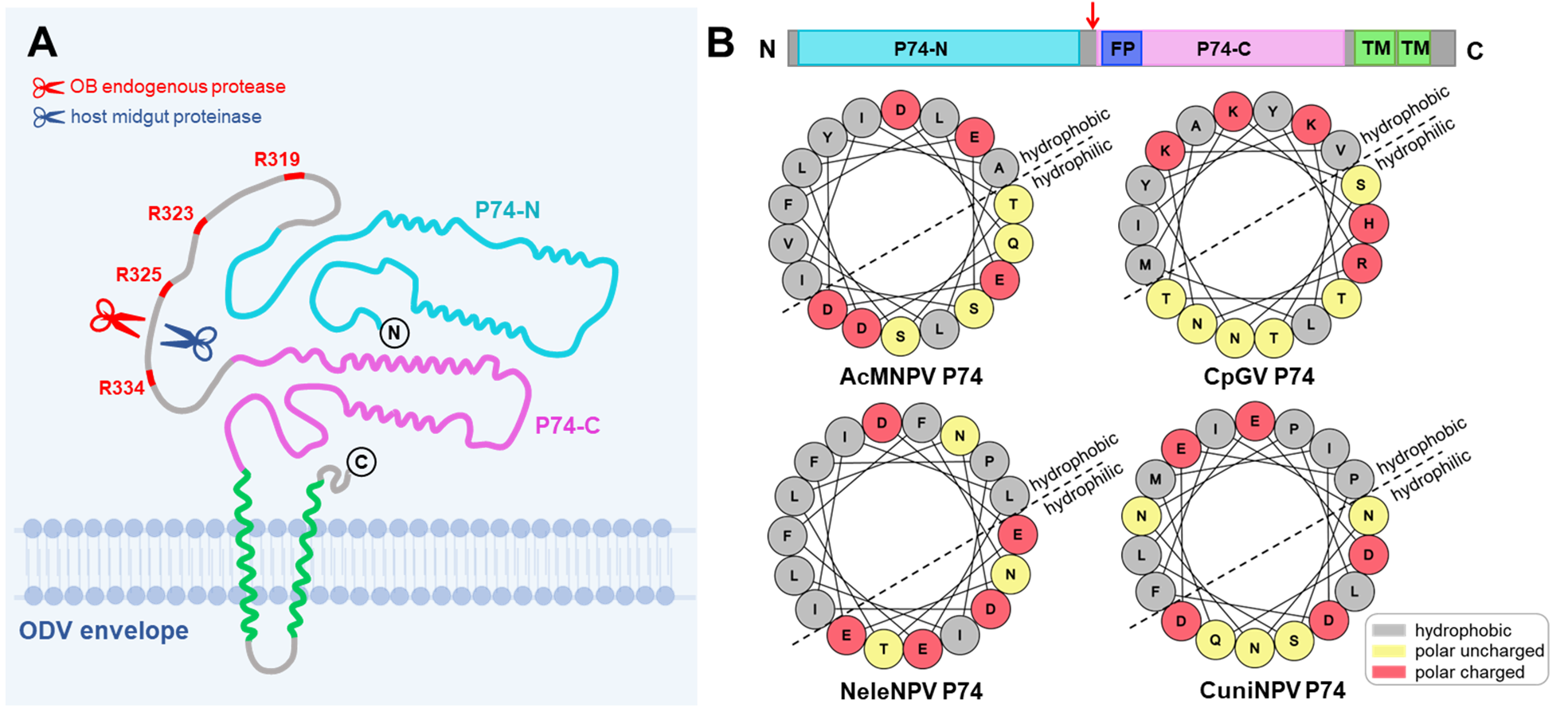 P74也称PlF0,是第一个发现的口服感染因子。该研究发现,P74会被包含体的内源蛋白酶以及宿主中肠的刷状缘膜囊泡(Brush border membrane vesicles,BBMV)在R325和R334位点发生剪切,剪切后会暴露出潜在的融合肽;如果剪切位点发生突变,则会显著降低病毒的口服感染能力。该研究修正了以往的P74剪切激活模型,并提出P74可能类似于I型膜融合蛋白在口服感染中发挥作用。