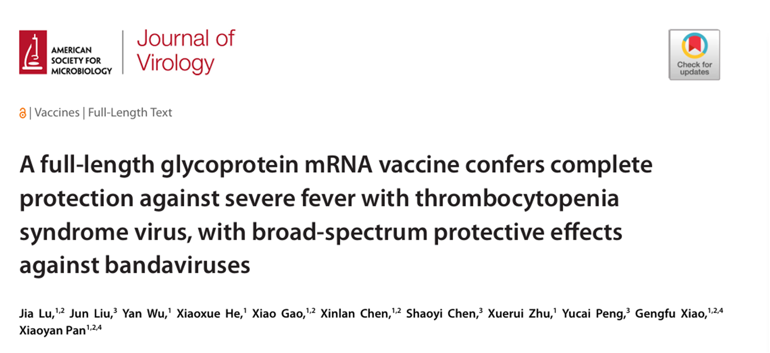 虫媒病毒在全世界范围内持续引发疫情,对人类生命健康造成较大影响,但特异性防治手段却极其有限。发热伴血小板减少综合征病毒(Severe Fever with Thrombocytopenia Syndrome Virus ,SFTSV)是近年来在亚洲国家持续流行的新型布尼亚病毒,其经蜱虫叮咬实现跨种传播,在蜱虫活动季节如5-8月份引发感染高峰。人感染后的典型症状为持续性发热、胃肠道不适、白细胞及血小板数目显著下降,严重者会出现多器官衰竭甚至死亡。近年来,SFTSV由山林、农村地区向城郊传播,在亚洲以外的国家如希腊、阿拉伯和美国等地也出现类似病例,其总体流行区域呈现扩大化。然而,针对SFTSV感染临床仅以支持性治疗为主,目前尚无获批的特异性药物或疫苗。中国科学院武汉病毒研究所肖庚富/潘晓彦团队和珠海丽凡达生物技术有限公司共同研制了一款SFTSV全长Glycoprotein(GP) mRNA疫苗,并对该疫苗的保护机制和预防效果进行了深入研究和评价。相关工作近期在国际专业病毒学期刊Journal of Virology(JVI)在线发表。