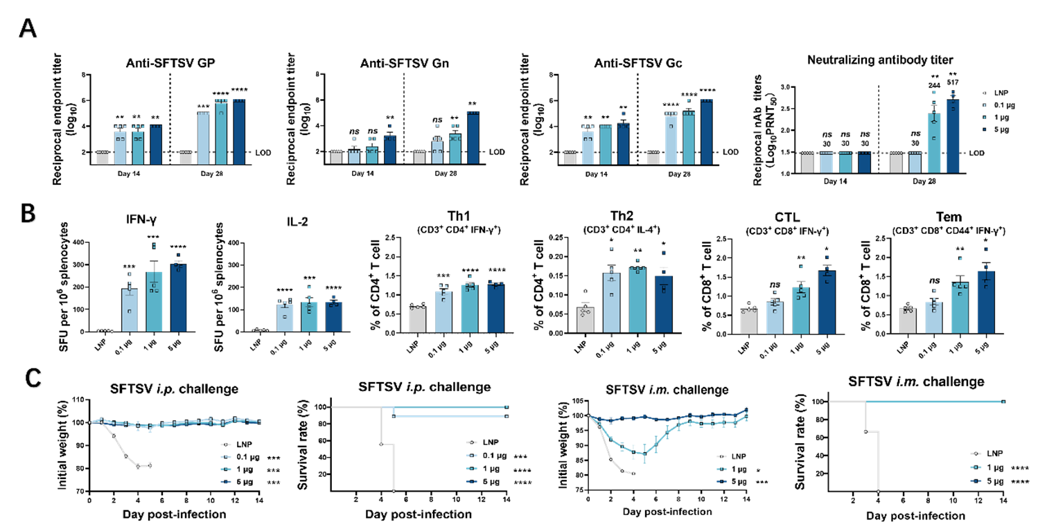(A-B:BALB/c小鼠经过不同剂量GP mRNA疫苗接种后,体内体液免疫和细胞免疫应答情况;C:A129小鼠接种不同剂量疫苗后,经腹腔和肌肉途径实施致死剂量SFTSV攻毒,其体重及存活情况)