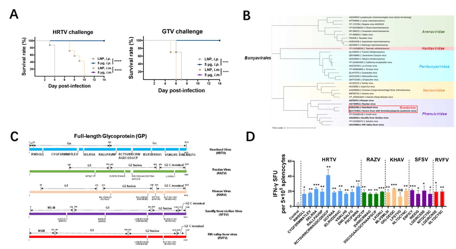 (A:AG129或A129小鼠接种疫苗后,经腹腔和肌肉途径实施致死剂量HRTV或GTV攻毒,小鼠存活率情况;B:班达病毒属和白纤病毒科病原在布尼亚病毒目中的进化位置;C: 来源于SFTSV全长GP的保守表位分析;D: SFTSV GP的潜在T细胞保护性表位鉴定)