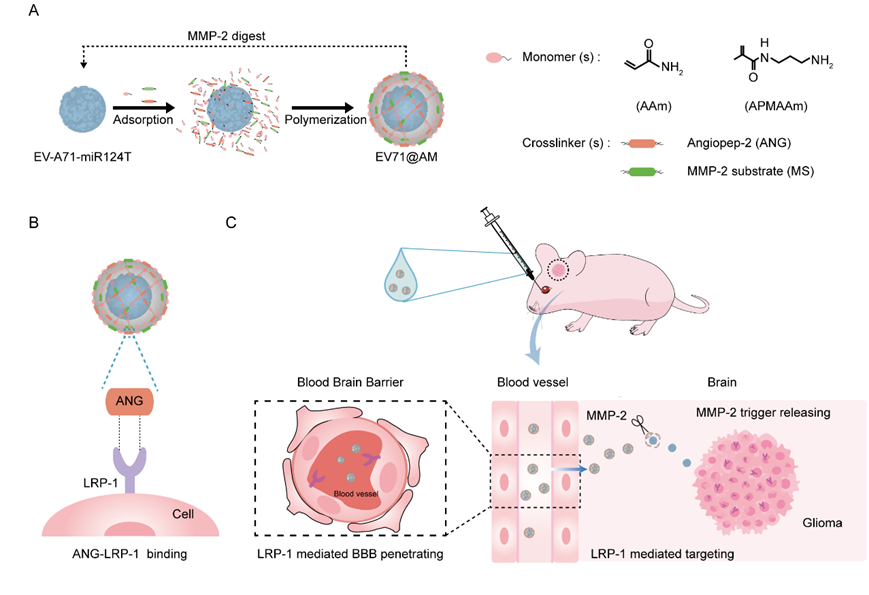 本研究中,研究人员将与低密度脂蛋白相关蛋白-1(高表达于血脑屏障和神经胶质瘤)具有高度亲和力的配体(Angiopep-2 ,ANG),以及可被基质金属蛋白酶(MMP-2)特异性切割的底物序列(MS)组装在溶瘤病毒表面,构建内部包装溶瘤病毒EV-A71-miR124T的纳米胶囊EV71@AM。纳米胶囊EV71@AM表面携带的ANG配体可基于靶向受体介导的转运实现血脑屏障的跨越,并经由肿瘤部位高表达的基质金属蛋白酶MMP-2切割,在肿瘤部位释放病毒颗粒杀伤恶性神经胶质瘤细胞。在该研究中,通过眼眶后静脉窦注射纳米胶囊EV71@AM,溶瘤病毒跨越血脑屏障进入小鼠大脑内,有效抑制肿瘤生长,显著延长荷瘤小鼠生存期。而且,该纳米胶囊不影响血脑屏障的完整性,不会导致血液学毒性和器官结构的改变,具有安全性。