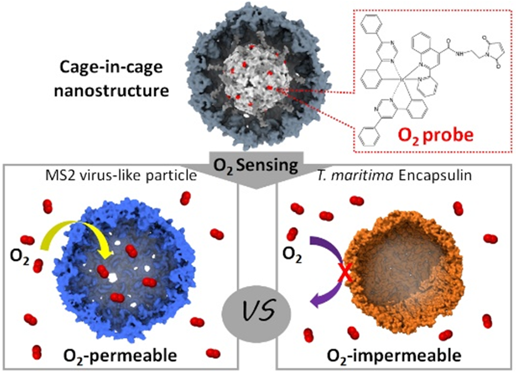 PNC广泛存在于生物界,是由蛋白亚基通过精确有序自组装形成的笼形纳米结构(如病毒衣壳、铁蛋白等),是限域催化、靶向递送、纳米疫苗等前沿领域的理想平台。PNC的多孔性可赋予其选择性物质通透性从而精确调控功能。其中,PNC的可控氧气通透性为氧敏感或氧响应型催化、药物递送、传感等应用提供了可能,近年来越发受到关注。然而,如何定量评价和精确调控PNC的氧气通透性目前还十分挑战。