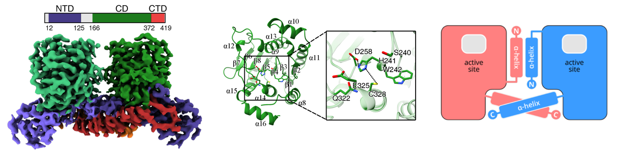 图1 猴痘病毒核心蛋白酶的整体结构、催化结构域特征及二聚化模式