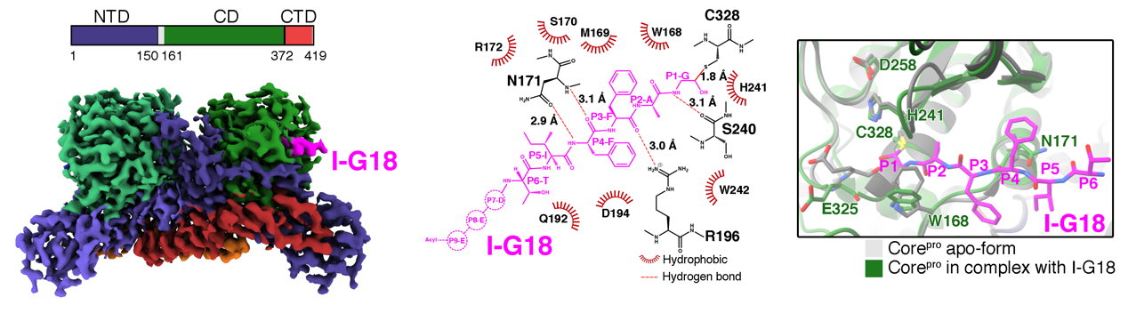 为了开发更强效的猴痘病毒核心蛋白酶抑制剂,研究团队开展了猴痘病毒核心蛋白酶底物识别和催化机制的研究。基于核心蛋白酶天然底物P25K序列,利用醛基替换切割断裂的酰胺键设计了底物类似物I-G18,期望能够与催化中心Cys328共价结合,模拟催化中间体的结构特征。研究团队通过冷冻电镜技术,成功解析了CorePro-I-G18复合物结构(图2)。与apo结构相比,在底物的诱导下,核心蛋白酶活性中心会发生一系列构象变化,暴露出催化活性中心,完成底物的水解。S1和S2口袋形成了特征性的狭长空腔,仅可容纳Gly(P1位)和Ala(P2位)等侧链尺寸较小的氨基酸残基,合理解释了正痘病毒核心蛋白酶Ala-Gly序列识别专一性。