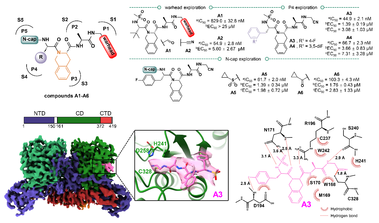 以核心蛋白酶的底物识别机制为基础,研究团队利用基于结构的药物设计策略设计合成了拟肽类抑制剂A1~A6,引入P1~P5片段分别占据核心蛋白酶S1~S5底物结合口袋,同时在P1位置连接亲电弹头warhead与催化中心Cys328残基共价结合(图3)。活性测试发现A2~A6具有高效的猴痘病毒核心蛋白酶抑制活性(IC50为44.9~100.3 nM),其中化合物A3活性最优,IC50达到44.9 nM,较底物衍生的九肽醛I-G18提高7倍(I-G18的IC50为314 nM)。为了阐明酶抑制活性的差异,研究团队解析了A1、A3和A4与核心蛋白酶的复合物结构,结果显示三个化合物均可与催化中心的Cys328残基共价结合,同时能够较好地占据底物结合口袋,其中A3的P4片段F原子能够与Asp194残基形成额外氢键相互作用,合理揭示了A3酶抑制活性更优的原因。抗病毒活性测试发现,化合物A3~A6具有较强的抗猴痘病毒活性(EC50为1.98~7.31 μM)和抗痘苗病毒活性(EC50为1.39~3.66 μM),具有广谱性;同时表现出良好的安全性,CC50均大于200 μM。相较于九肽醛I-G18,拟肽类化合物的抗病毒活性显著提高(I-G18在50 μM浓度下未显示出抗病毒活性)。研究结果表明,A3~A6是良好的先导化合物,有望通过进一步成药性结构优化开发出广谱抗正痘病毒药物。
