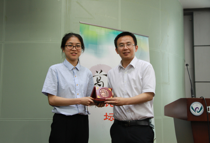 报告会上,周荣斌教授简要介绍了天然免疫系统的组成与功能,生动地向同学们展示了炎性小体的组成,以及目前所发现炎性小体的分类。接着,周教授与同学们分享了近年来其实验室的研究进展——发现了RNA病毒激活NLRP3炎症小体的机制,抗炎脂肪酸Omega-3对NLRP3炎症小体的抑制作用,以及一种炎性小体的负调机制:多巴胺通过泛素化途径降解NLRP3炎症小体。最后,感染与免疫学实验室徐秋平同学代表全所研究生为周荣斌教授赠送了“葛洪论坛”纪念章。