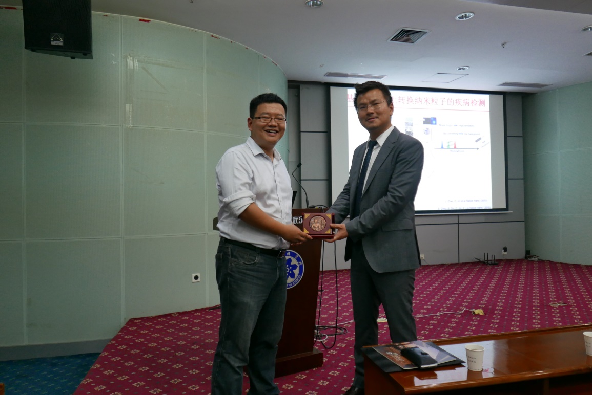 报告会上,师冰洋教授系统地阐释了纳米粒子(NPS)的概念,并介绍了其诊断应用的发展平台,如生物成像、诊断、药物、基因传递、生物传感器和光动力疗法。据其介绍,纳米颗粒可以在各种核心材料(金属、半导体、二氧化硅和有机聚合物)的基础上进行设计和开发,并在合成过程中,通过调整反应条件,如时间、温度和催化剂,控制其大小和形态,并对其表面进行修饰。据其介绍,各种表面官能团和靶向配体可以被引入到核心材料作为一个额外的结构域,从而调节纳米粒子表面特性能更好地应用于生物医学。随后,报告重点介绍了在过去的五年中已经设计和开发的各种先进纳米颗粒,包括聚合物纳米粒子、以纳米凝胶为基础的纳米颗粒、介孔二氧化硅纳米颗粒和转换纳米。而这些先进的纳米颗粒广泛应用于药物、基因传递、早期癌症的检测和光动力治疗,具有潜在的医学应用前景。会后,在场师生就纳米颗粒的应用等问题与师冰洋教授进行了热烈的讨论和交流。门冬副研究员代表武汉病毒研究所为他颁发了“葛洪论坛”纪念章。