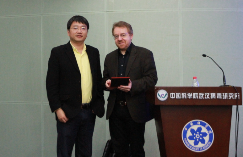 报告会上,据Curry教授介绍,起始翻译是正链RNA病毒生活周期早期的关键步骤,因为病毒基因组复制依赖于病毒蛋白的产生。其中诺如病毒翻译起始取决于与病毒RNA5'末端共价连接的VPg蛋白。而且实验表明,诺如病毒的VPg通过与真核生物启动机制的关键组件 eIF4G直接相关,确定了其相互作用位点,分别是VPg蛋白的C端区域和eIF4G中保守的HEAT-1区域。Curry教授详细解析了该相互作用的重要结构细节,并揭示调控病毒翻译起始的分子机制。这些研究,对从分子与结构生物学方面深入理解小RNA病毒与诺如病毒复制增殖的机制具有重要科学价值,对抗病毒药物及疫苗的研发具有现实的指导意义。会后,周溪研究员代表病毒所为他颁发了“葛洪论坛”纪念章。