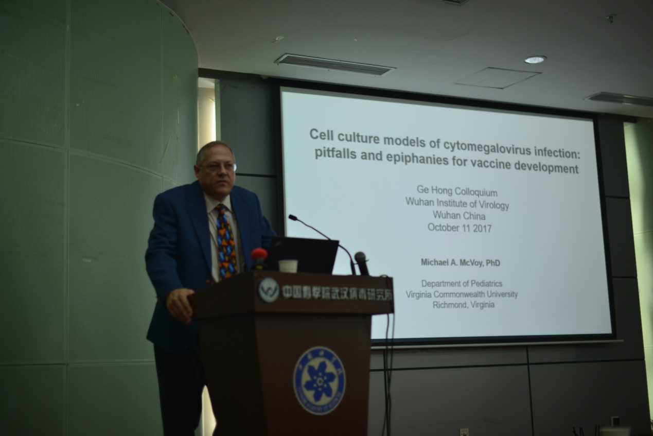 2017年10月11日,应“葛洪·资深论坛”邀请,弗吉尼亚联邦大学(Virginia Commonwealth university)Michael A. McVoy教授在武汉病毒研究所1号会议室为广大师生带来了一场题为“Cell culture models of cytomegalovirus infection:pitfalls and epiphanies for vaccine development”的精彩学术报告,报告由罗敏华研究员主持。