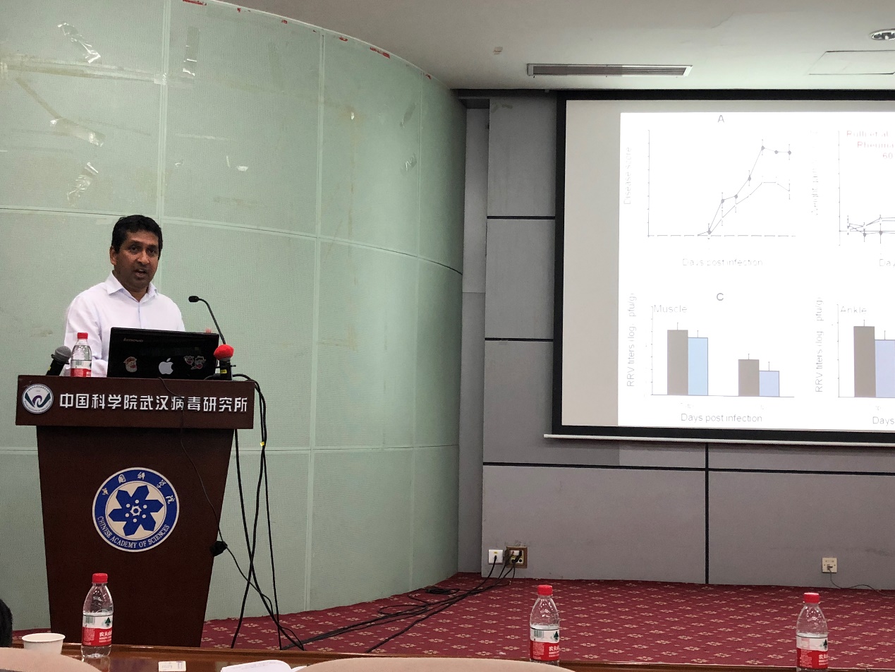 报告会上,Suresh Mahalingam教授详细介绍了甲病毒属病毒,如基孔肯亚病毒(chikungunya virus,CHIKV)、Ross River virus等感染如何诱导产生骨骼肌炎症性疾病,并开创性地发现感染还可导致人骨质流失。在研究甲病毒感染的致病机理过程中,Mahalingam教授发现了能有效减轻感染所引发的骨骼系统疾病的药物,进一步证明了感染后宿主免疫系统的炎症反应是导致骨骼系统疾病的重要原因。Mahalingam教授的实验室长期致力于动物感染模型的研究,在此基础上开展了一系列重要虫媒病毒的疫苗研究。据其介绍,CHIKV核衣壳蛋白上10个氨基酸突变(CHIKV-NoLS)可有效降低CHIKV的致病性,并对感染小鼠产生良好的免疫保护作用,可作为减毒活疫苗的候选株。他们还建立了一种新型的寨卡病毒(zika virus,ZIKV)感染小鼠模型,其临床症状和免疫系统各指标均与对照组有显著的差异,不仅可用于研究病毒感染后宿主产生的各种疾病,还可用于评估ZIKV疫苗的保护效果。