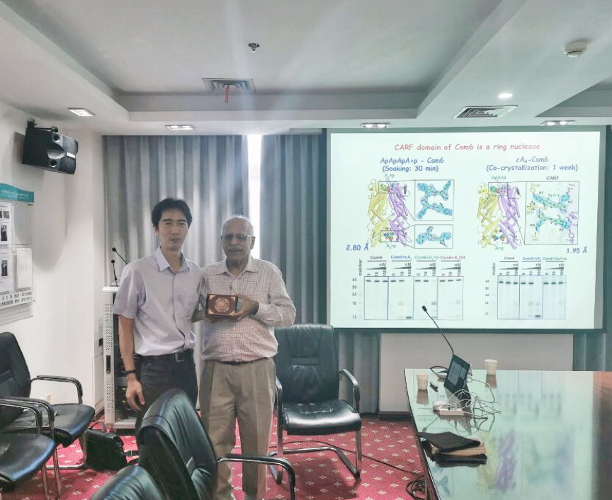 报告会上,Patel教授介绍了其近几年来带领团队开展的关于RNA沉默和表观遗传调控的结构生物学的研究工作。首先,他从结构生物学角度解释了cGAS是如何识别细胞质中双链DNA,另外还介绍了III型CRISPR-Cas监测复合物的3种酶活性。最后,Patel教授向大家讲解了多亚基I-F型Csy级联及其复合物。会后,在场师生与Patel教授进行了热烈的交流与讨论。武汉病毒所副所长龚鹏代表研究所为他颁发了“葛洪论坛”纪念章。