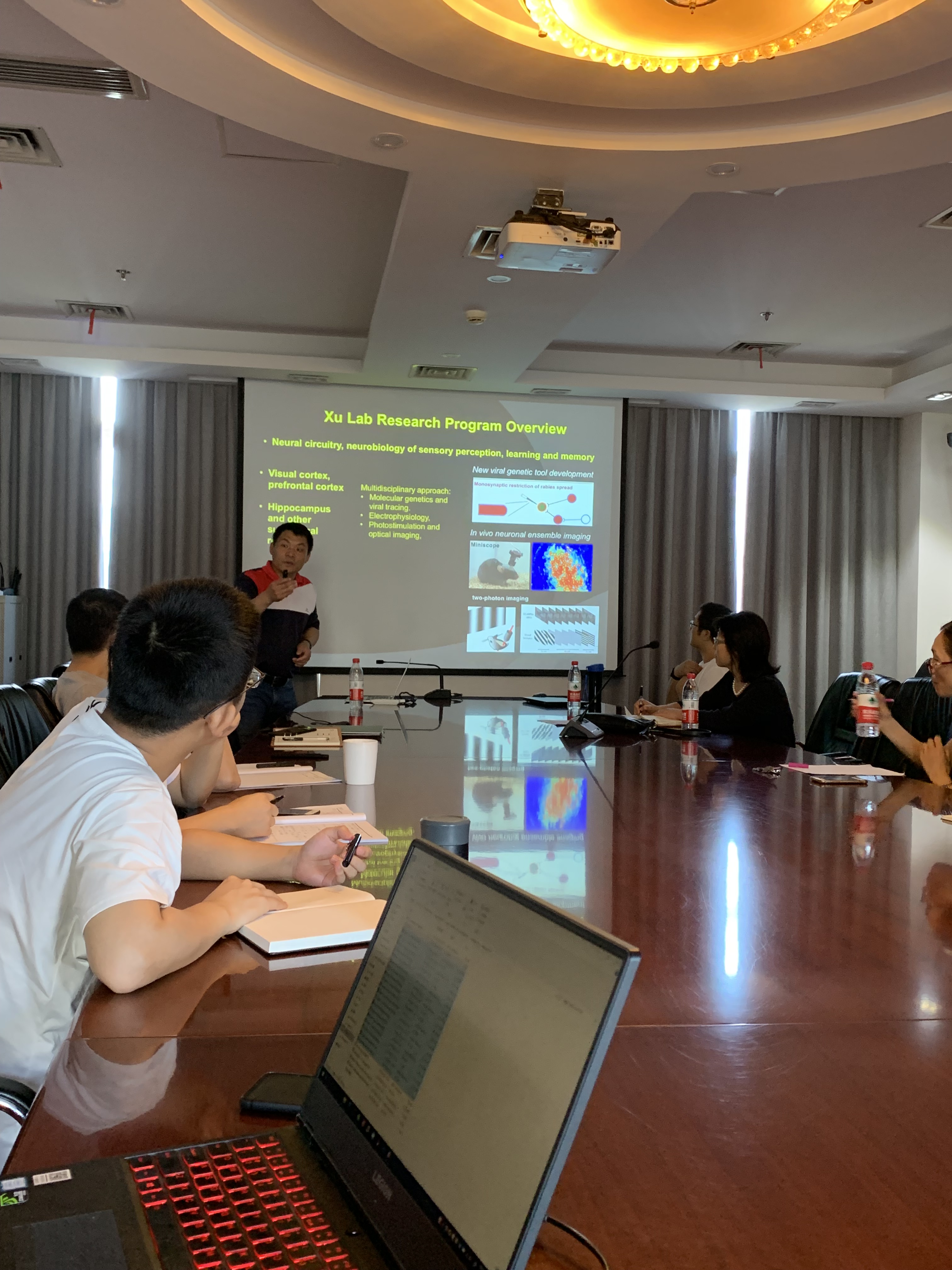 神经环路的解析对于脑功能和脑疾病的理解至关重要。新的病毒工具在近年神经环路的解析中发挥了极其重要的作用。报告会上,徐教授介绍了他们实验室利用新型遗传改造的病毒工具解析空间学习与记忆环路中海马的联结:下丘投射到海马CA1,皮质投射到海马的神经环路,这些新的神经环路联结及其功能的新发现为阿兹海默症中记忆损害提供了新的线索和治疗靶点。目前,徐教授实验室在阿兹海默模型小鼠基础上,通过图案刺激非典型的下丘到海马的反投射学习,来恢复空间记忆,取得了重要进展。并与我所罗敏华团队等合作获得NIH BRAIN INITIATIVE 的资助(NIHRF1),研发新型神经环路示踪工具。会后,在场师生与徐教授进行了热烈的交流与讨论,并交流和讨论了后续工作进展。