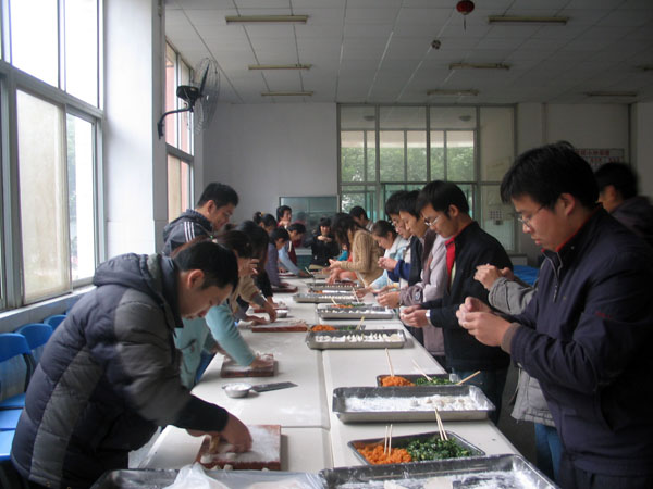 2007年12月22下午,中科院武汉教育基地食堂洋溢着温馨的气氛。平时分散的桌子被拼成了一列,擀面杖、砧板、菜刀、……这些一直深藏于后方默默地为同学们服务的厨具今天被请出来了。在食堂师傅们的指点之下,我所07级硕士研究生正围在一起对付一块块面团。平时奔走于图书馆和实验室的同学们今天要自己动手包饺子了!