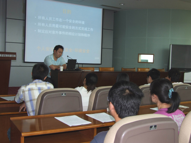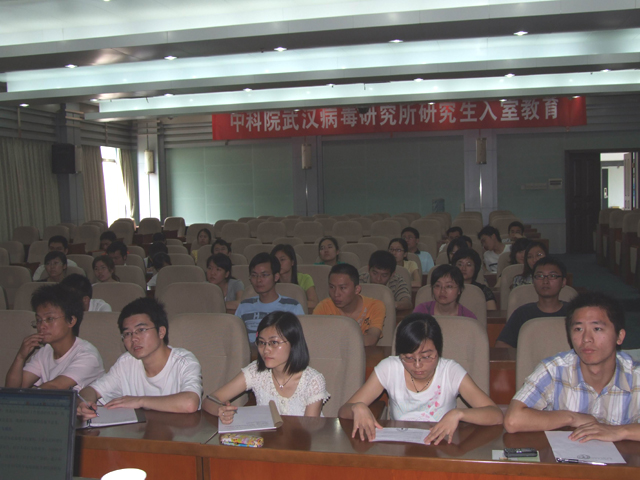 5月19日,武汉病毒所研究生部组织07级研究生进行一年一度的新生入室教育。活动以讲座的形式开展,主讲人为陈士云研究员、张治平研究员、宋冬林主任,他们的主讲内容分别是科研学术道德规范、大型实验仪器的使用和实验室安全知识。活动由研究生部徐红革老师主持。07级41名硕士研究生参加了此次新生入室教育。