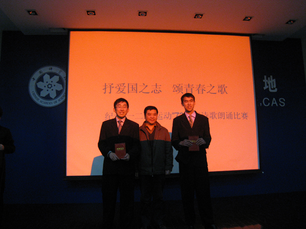 在恢宏的背景音乐旋律中,我所曹亮与戴陈伟同学饱满深情地朗诵了《2008中国骄傲》,充分诠释了当代青年的爱国热情,颂扬了爱国主义的传统精神和改革创新的时代精神,将现场气氛带上了高潮。经过激烈的角逐,他们最后以9.42的高分从11支参赛组中脱颖而出获得了此本比赛的一等奖。侯典海《沁 园春雪》和邵玲《纪念一二九 共图中华强》则分别获得了二、三等奖。