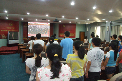 7月1日上午,武汉病毒研究所党委组织在职职工、全体学生党员集中收看了胡锦涛总书记在庆祝中国共产党成立90周年大会上的重要讲话实况。在职职工、青年学子大受鼓舞,纷纷表示,要坚定信念,刻苦学习、勤奋工作,用信念激励自己,用知识武装自己,用实际行动服务人民,报效祖国。