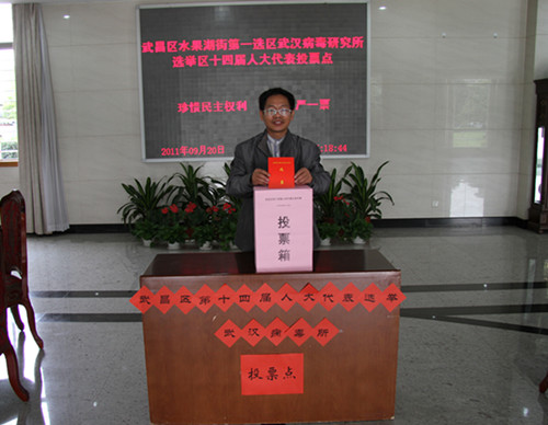 9月20日,武汉病毒所登记的选民在研究所一楼大厅投票点参加了武昌区第十四届人大代表换届选举。所长陈新文、党委书记袁志明、副所长杨荣阁、党委副书记余平凡等所领导与全所选民一起参加投票,认真行使民主权利。