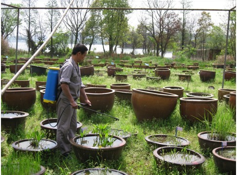 针对这种现状,病毒所与植物园联合启动实施了“生物灭蚊”项目,依托病毒所在生物灭蚊领域的科技优势,采用生物杀蚊幼剂制品,对植物园园区内的蚊虫幼虫进行集中灭杀。自3月中旬以来,病毒所虫媒病毒及媒介控制学科组科技人员深入植物园的林间草丛、水域沿岸,密切监测蚊虫消长规律,对蚊虫的孳生地进行了细致的调查,对蚊虫孳生地加以全面掌握。随后在4月中旬,根据前期掌握的蚊虫孳生情况,在蚊幼虫孳生地集中喷洒生物杀蚊幼剂。