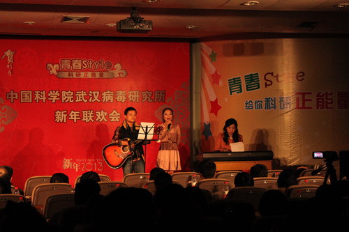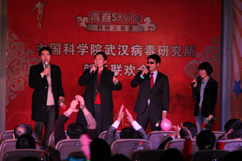 整场晚会高潮迭起,精彩纷呈。不仅有来自武汉病毒所各年级研究生、博士生的精彩演出,更有研究员李朝阳、龚鹏、王延轶、关武祥,管理支撑部门刘汝、何满等的倾情加盟。情歌串烧《牵手走过2012》温馨浪漫,幸福甜蜜;由陈建军、何满等老师表演的诗朗诵《盛世中国》讴歌了辉煌灿烂、勇于探索的改革开放30年,激励我们为中华民族的伟大复兴昂首向前;胡伟等同学的吉他弹唱《旅行》洒脱大气;刘汝等老师的舞蹈《龙文》则曼妙优美、如行文流水;PI组合演唱的《大约在冬季》更是将现场气氛推向高潮。