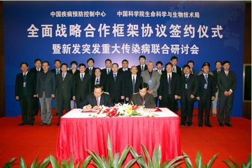 近期,由中科院生物局、中国疾控中心、中科院北京生命科学院和中科院传染病网络中心联合举办的“新发突发重大传染病联合研讨会”在北京召开。中科院张亚平副院长、卫生部刘谦副部长出席会议,中科院生物局张知彬局长与中国疾防中心王宇主任代表双方签署了《全面战略合作框架协议》。卫生部科教司何维司长,中国疾控中心病毒病所侯云德院士,中科院植生生态所赵国屏院士,中国疾控中心传染病所所长徐建国院士、中国疾控中心高福副主任、中科院武汉病毒所陈新文所长,中国疾控中心病毒病所李德新所长,中国疾控中心寄研所梁国栋副所长,中科院上海巴斯德所蓝柯副所长等150余位领导和专家学者济济一堂,共同见证签约。