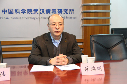 2月22日,中国科学院生命科学与生物技术局局长许瑞明,在武汉分院院长、武汉病毒所党委书记、副所长袁志明,武汉分院科技合作处处长李伟等陪同下,到武汉病毒所调研。武汉病毒所所长陈新文、副所长杨荣阁、党委副书记、纪委书记余平凡,有关学科带头人、职能部门负责人参加了调研活动。