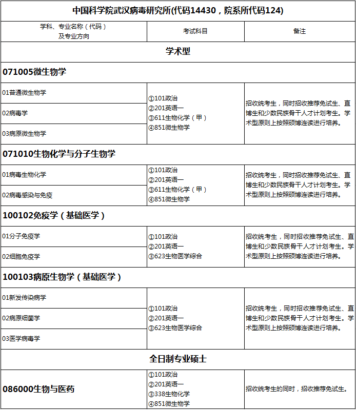 武汉病毒所2024年硕士研究生招生目录